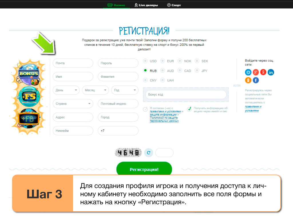 - заполнить в анкету: ФИО, тип валюты, адрес электронной почты, страну и год рождения, никнейм и код на вход в аккаунт;